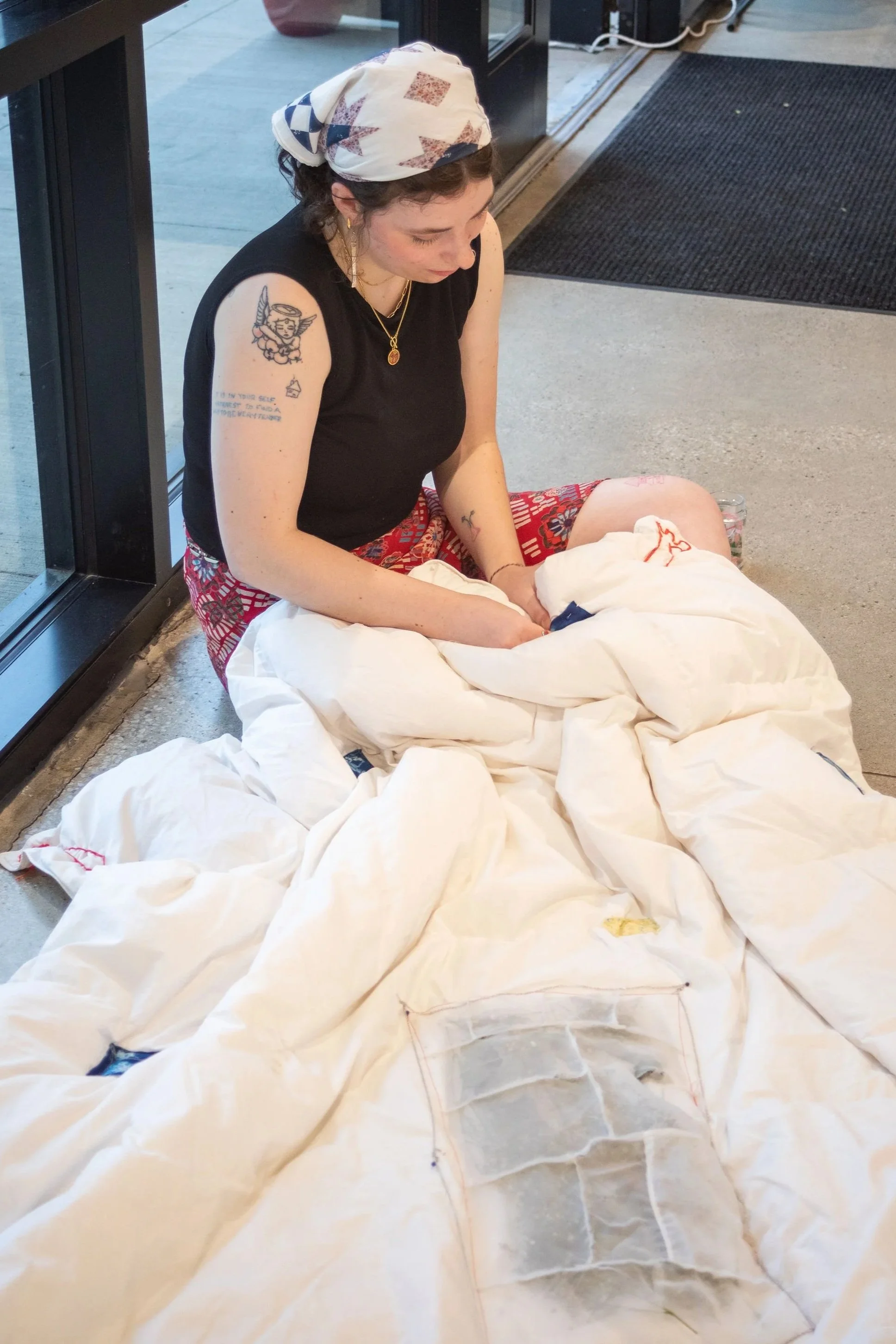 Drawing on family traditions passed down from her Nana, who taught her to sew, Berry reinterprets quilting, lace, and weaving as ways of engaging with memory. She centers reuse through secondhand and natural materials, which carry embedded histories of labor and care. Performative gestures of ripping, cutting, pulling, and stitching further emphasize the physical effort and time that define fiber work. By combining craft with performance and installation, Berry positions quilts not only as carriers of the past but also as active sites of transformation, blurring the boundaries between memory, tradition, object and action, labor and care.