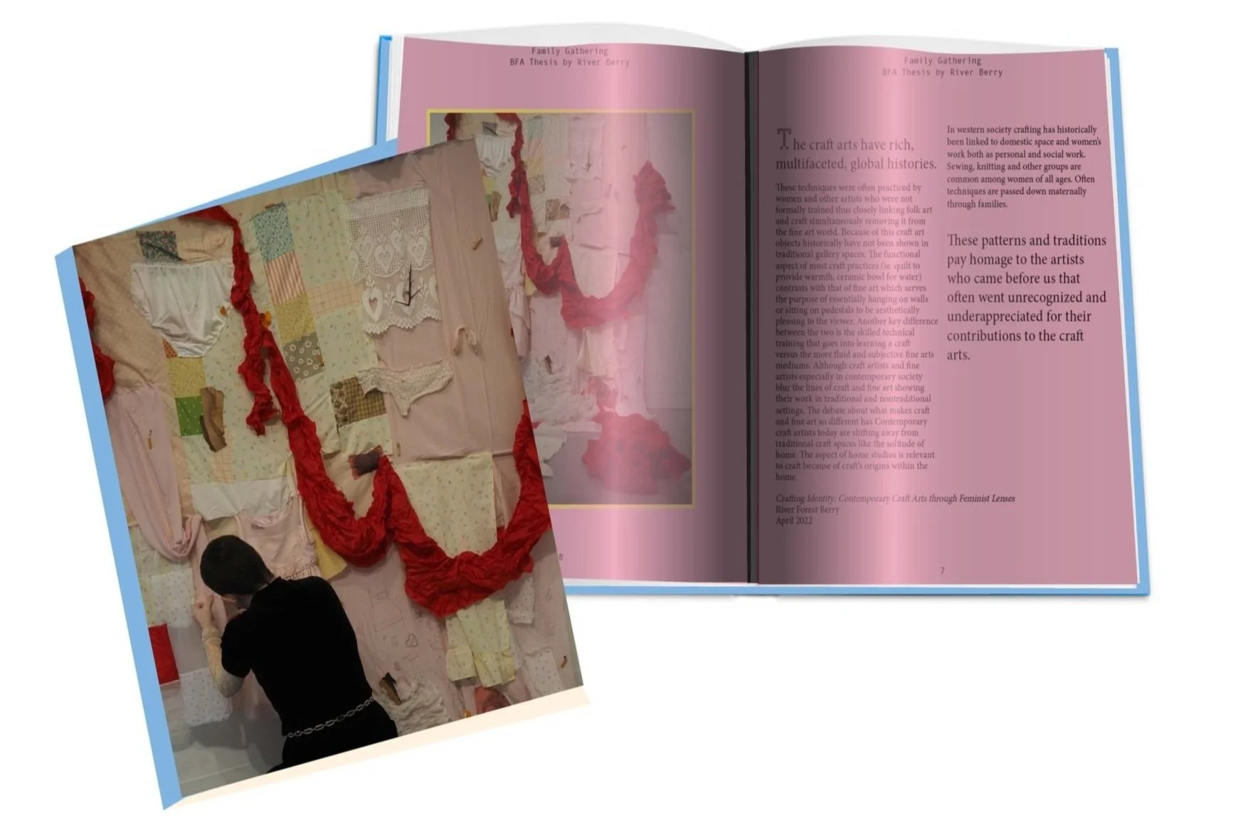 A 25 page paperback book. Family Gathering is a collection of short essays which presents the culmination of my senior thesis at Columbus College of Art & Design. My studio and art historical practices are showcased through colorful images of artwork and quotes from my thesis paper Crafting Identity: Contemporary Craft Arts through a Feminist Lenses. The breadth of techniques and applications of both fiber art and printmaking are used in my work to create portraits of myself and my family members.These portraits give the viewer intimate insight into the lives of those portrayed in conjunction with complex social issues. I link my craft practice to other women artists using handed-down or discarded materials. This book presents the viewer with an all-encompassing understanding of my creative practice.
