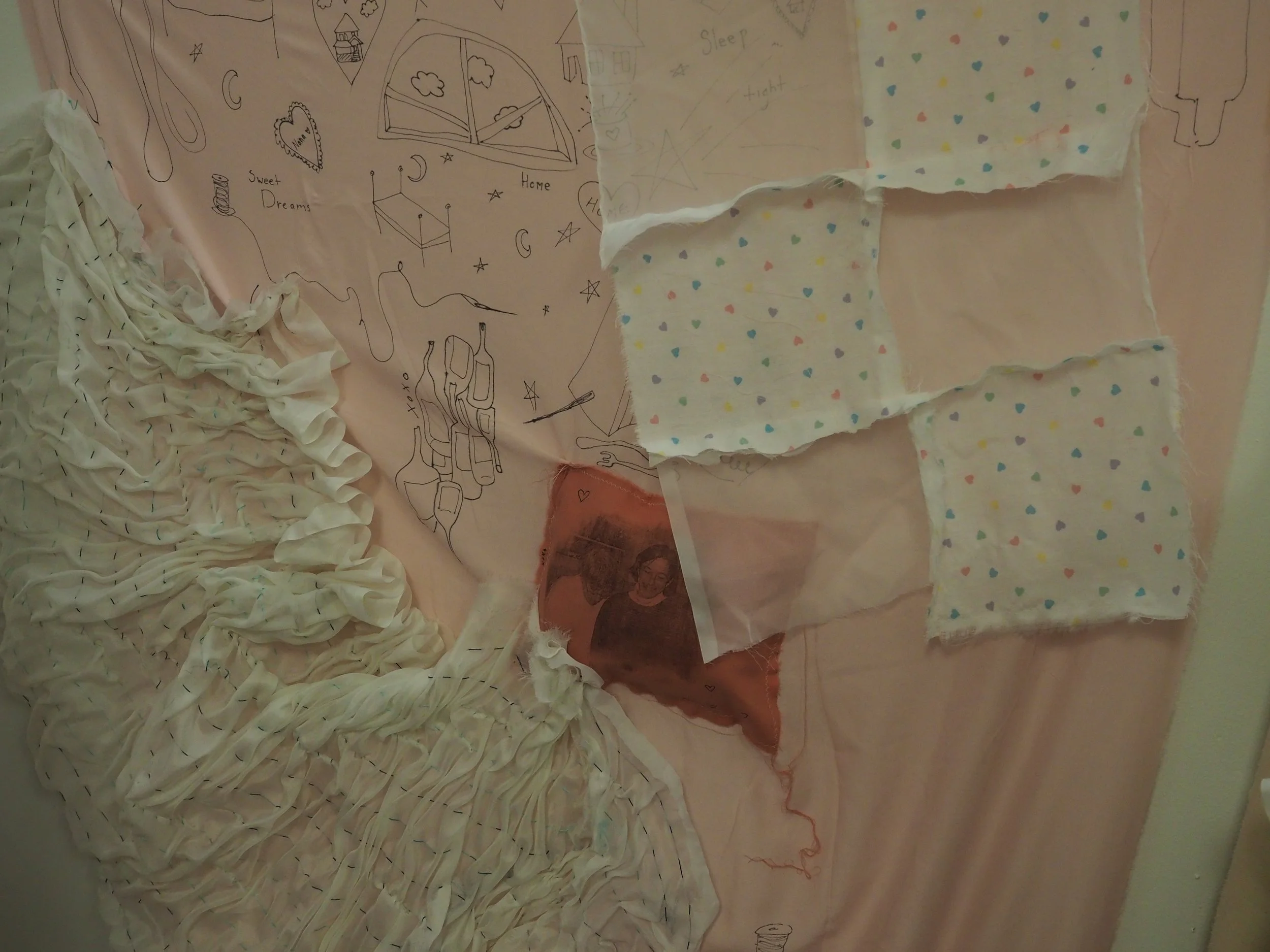When you enter the space it resembles a bedroom with a queen-size mattress in the middle of the floor. Other soft forms surround the viewer both on the walls and floor. Untitled (sweet teeth) and other works about the artist's mother are placed closest to the mattress to emphasize the importance of this relationship to the artist.